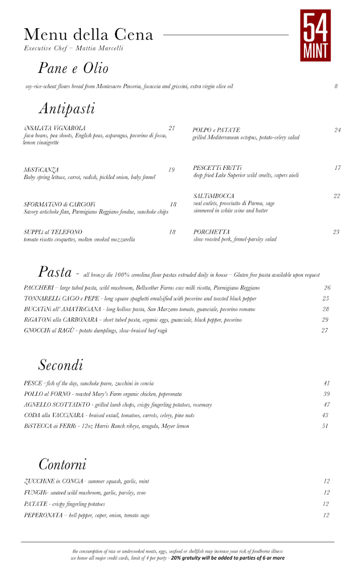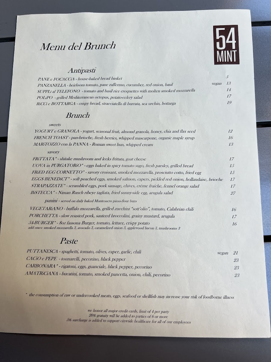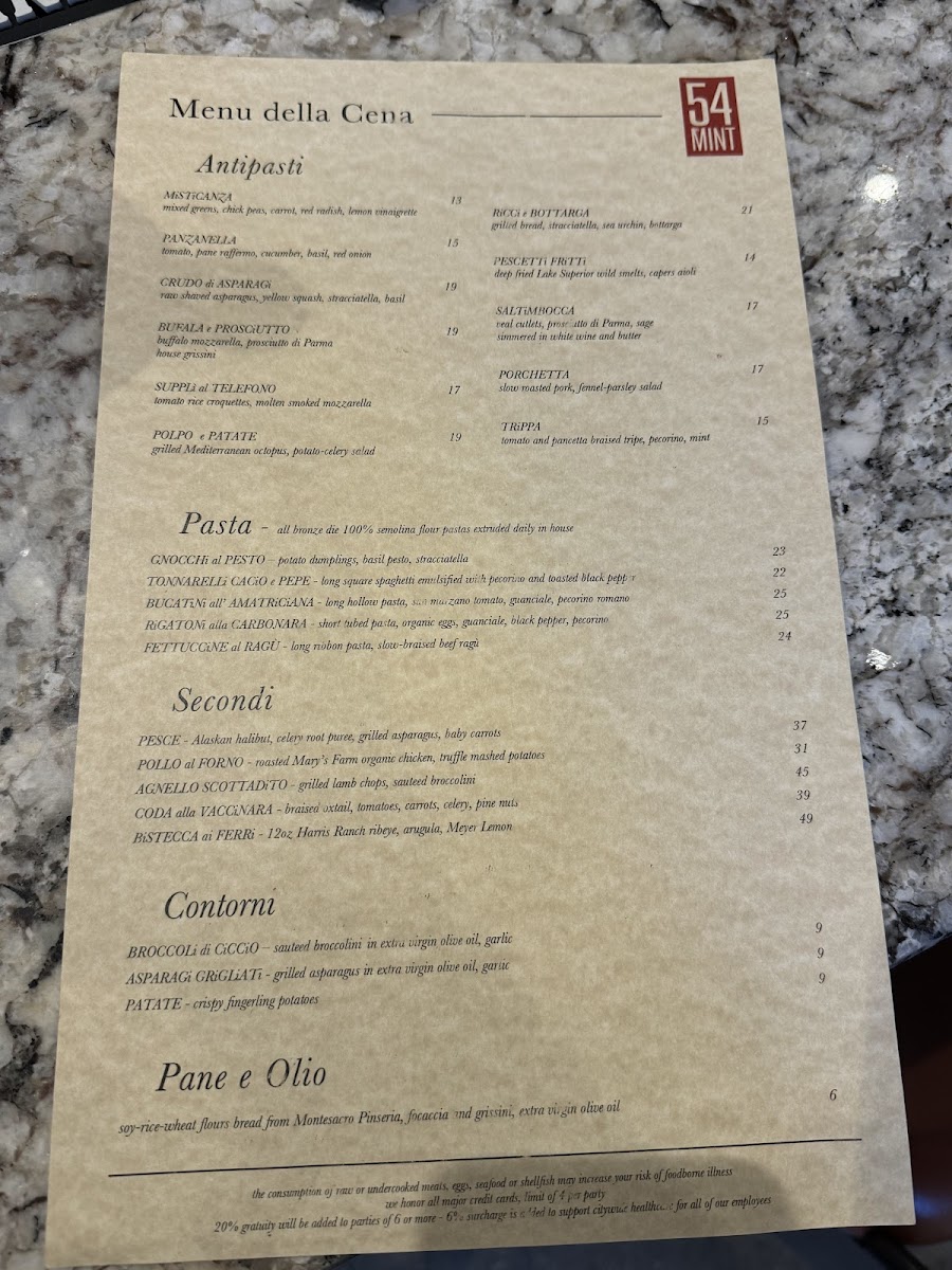 Cuisine: At 54 Mint, the menu is a celebration of vibrant flavors and high-quality ingredients. You can indulge in a selection of traditional antipasti like the Stracciatella Crostone, featuring housemade grilled bread topped with creamy stracciatella, anchovy fillet, squash blossom, and grated bottarga for just $20. Don't miss their delectably light Panzanella salad, a harmonious blend of watermelon, basil, and pickled onion, perfect for those warm evenings.