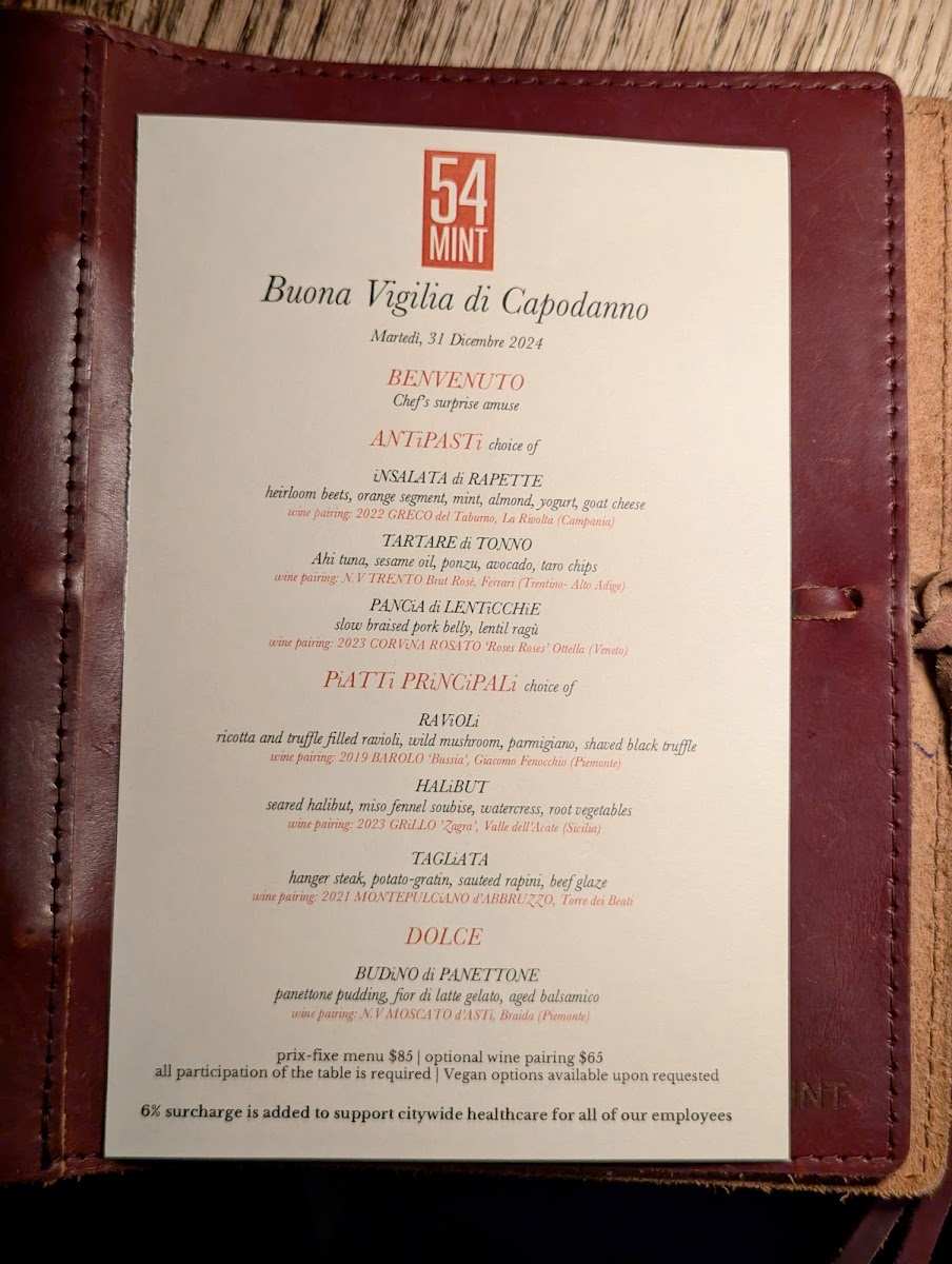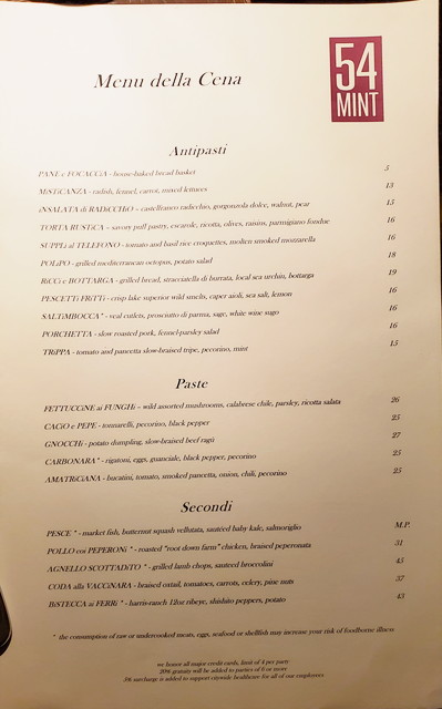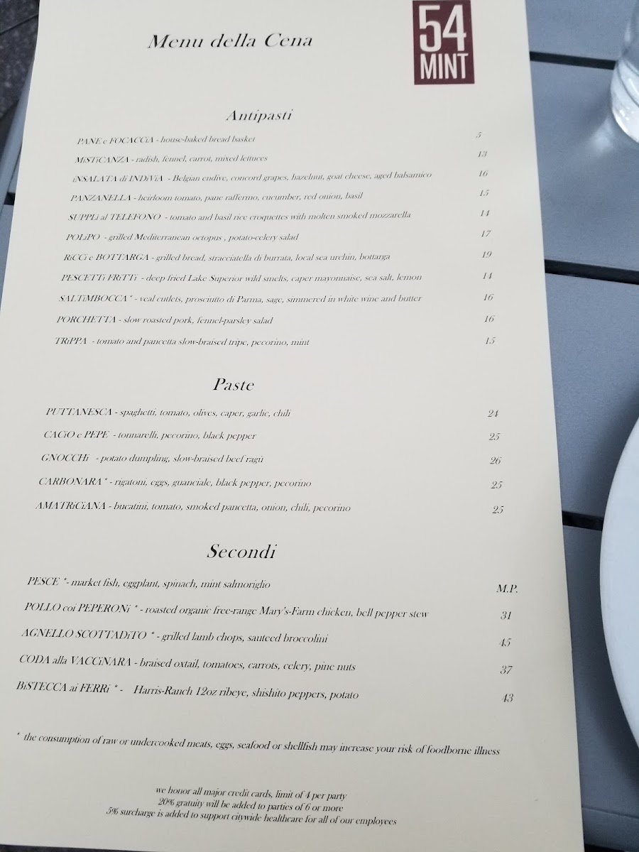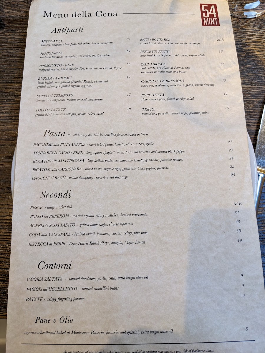 Cuisine: At 54 Mint, the menu is a celebration of vibrant flavors and high-quality ingredients. You can indulge in a selection of traditional antipasti like the Stracciatella Crostone, featuring housemade grilled bread topped with creamy stracciatella, anchovy fillet, squash blossom, and grated bottarga for just $20. Don't miss their delectably light Panzanella salad, a harmonious blend of watermelon, basil, and pickled onion, perfect for those warm evenings.
